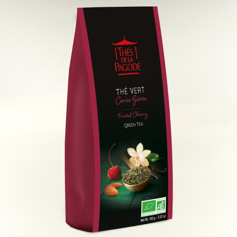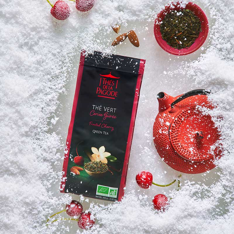 Cerise givrée – 100gr – Le thé vert cerise givrée est un thé vert bio réconfortant aux notes gourmandes de cerise confite d’amande et de la vanille.