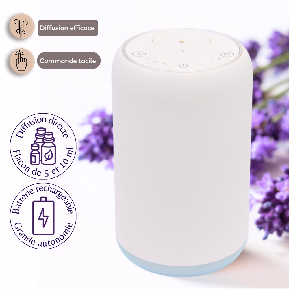 Son usage est simplifié : inutile de transvaser ou diluer une huile dans un réservoir. Il suffit de visser directement le flacon d’huile essentielle (de 5 ml ou 10 ml) sur la tête de diffusion.