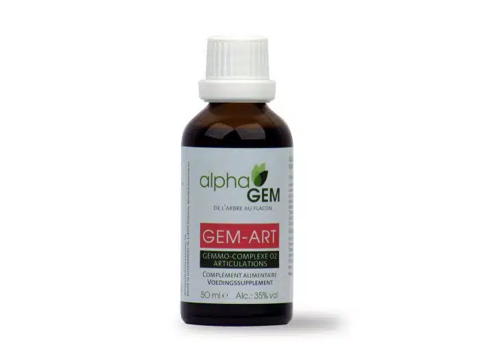 Flacon de 50 ml – Le complexe GEM-ART est composé de 4 extraits de bourgeons qui améliorent la souplesse des articulations : la vigne, le bouleau et le cassis et le pin.