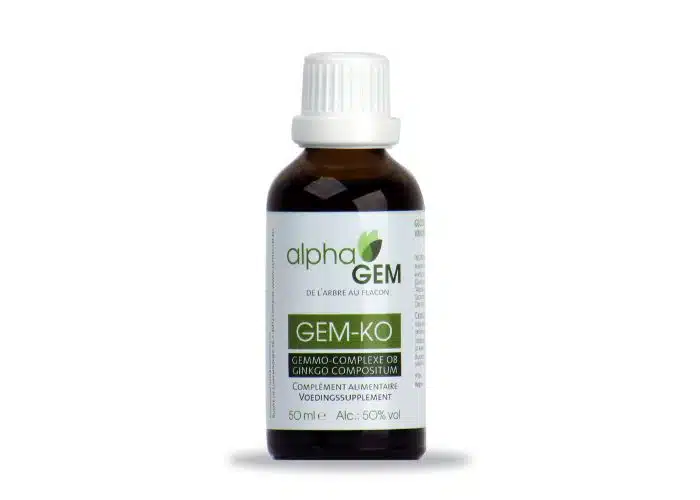 Flacon de 50 ml – Le complexe GEM-KO combine toutes les propriétés du gingko biloba. Il est rendu plus efficace grâce à une association de macérat-mère de bourgeons frais.