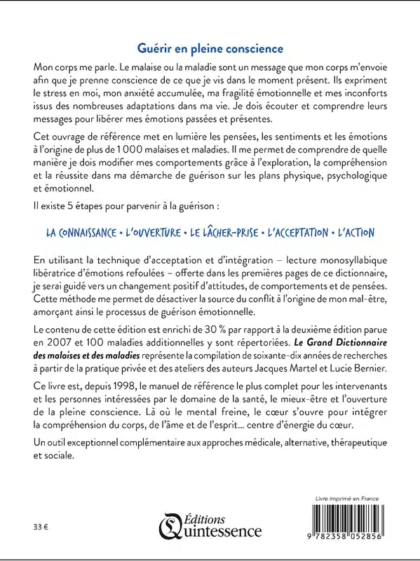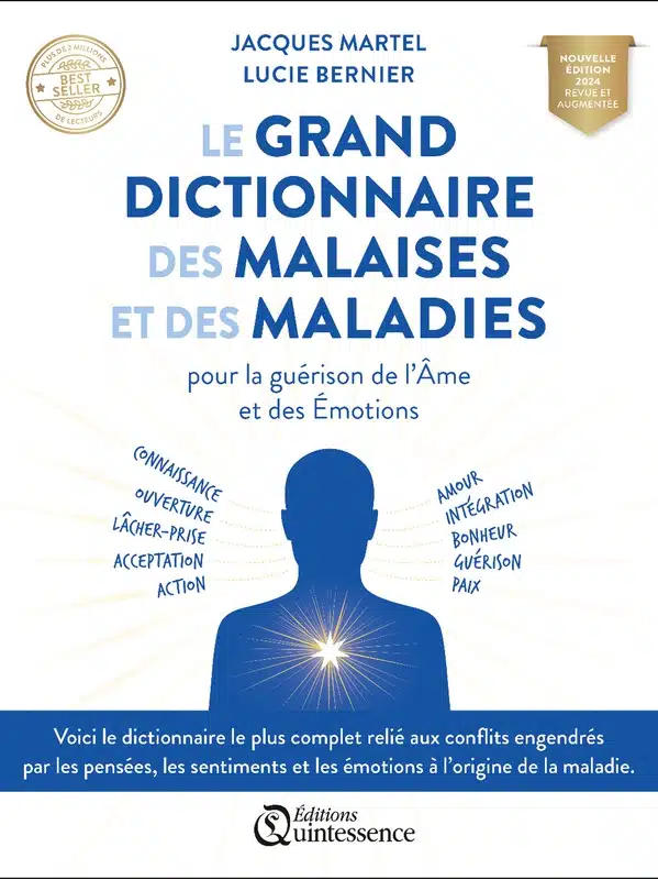 Le grand dictionnaire des malaises et des maladies est devenu un best-seller avec plus de deux millions de lecteurs. Il est le plus grand dictionnaire sur les causes des malaises et des maladies reliées aux pensées, aux sentiments et aux émotions. Il propose la Technique d’intégration et d’acceptation, qui permet de prendre conscience de l’origine de nos malaises afin de désactiver la source du conflit qui est à l’origine du mal-être.