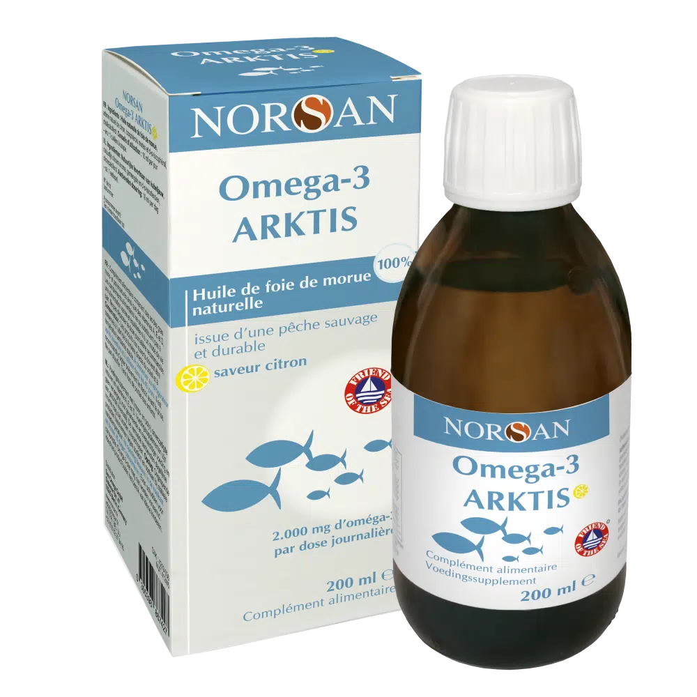 Oméga-3 Arktis (200 ml) est une huile de foie de morue liquide naturelle et pure issue d’une pêche durable en Arctique. Une dose journalière de 10 ml (soit environ 1 cuillère à soupe) apporte 2000 mg d’acides gras oméga-3 (EPA et DHA) mais aussi 800 UI de vitamine D3.