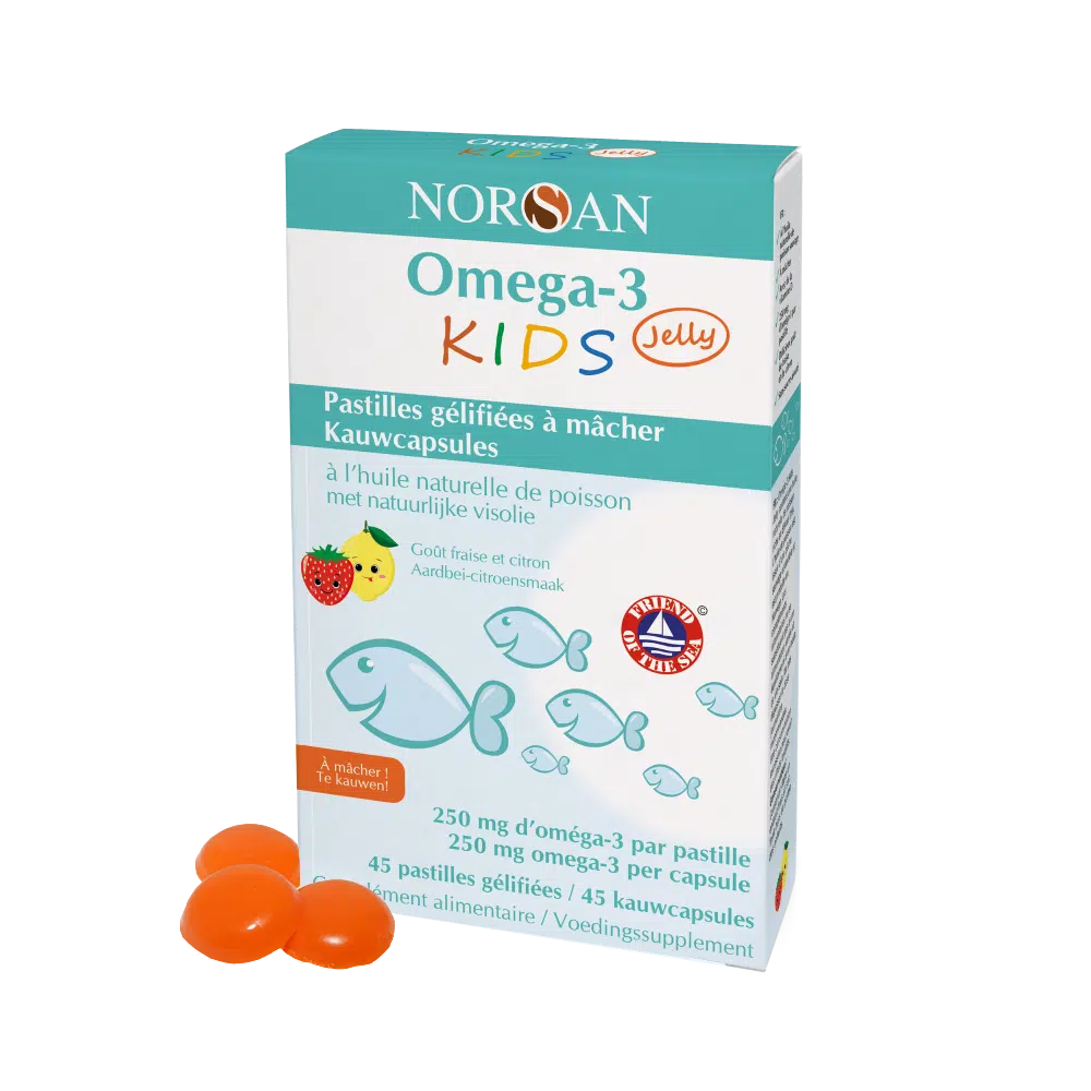 Les deux acides gras marins EPA (acide eicosapentaenoïque) et DHA (acide docosahexaenoïque) sont importants pour le bon développement mental et physique d’un enfant. En outre, les problèmes de concentration peuvent être compensés par un taux suffisant d’oméga-3 dans l’organisme. C’est pourquoi Omega-3 KIDS Jelly contient l’huile de poisson NORSAN riche en acides gras oméga-3 marins EPA & DHA.