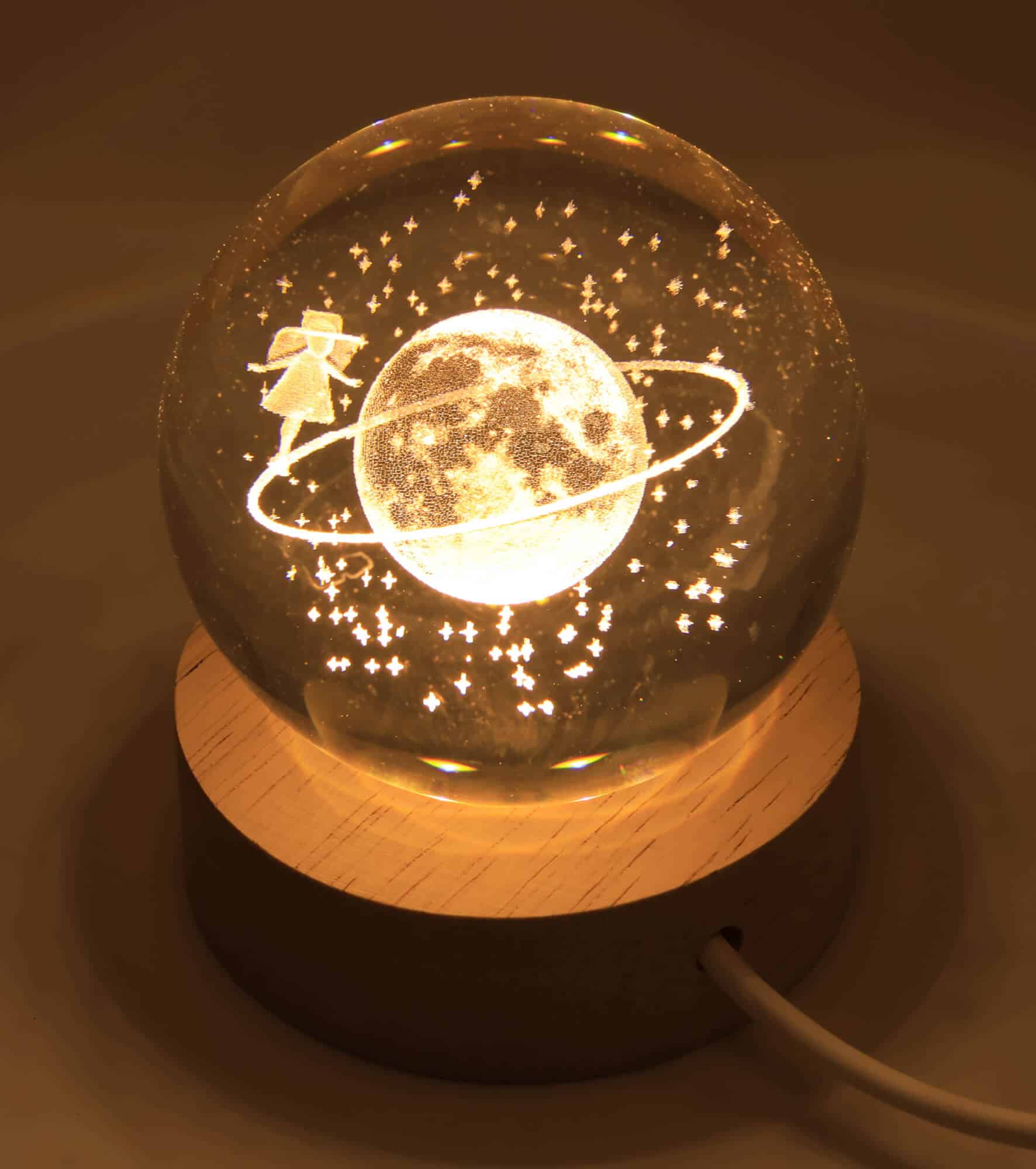 Veilleuse USB Verre Saturne 6 cm est une petite sphère lumineuse en verre, créant une ambiance douce et apaisante dans la pièce.